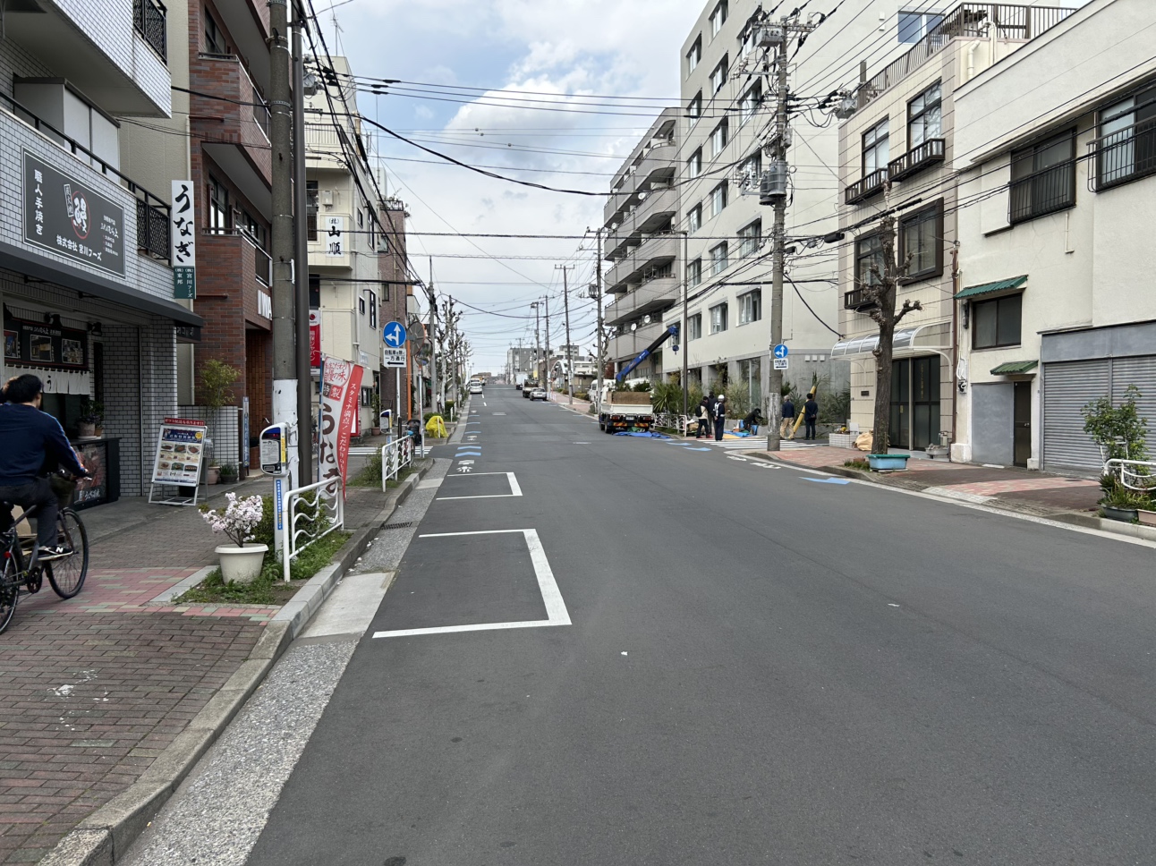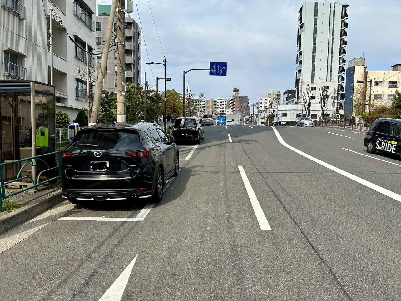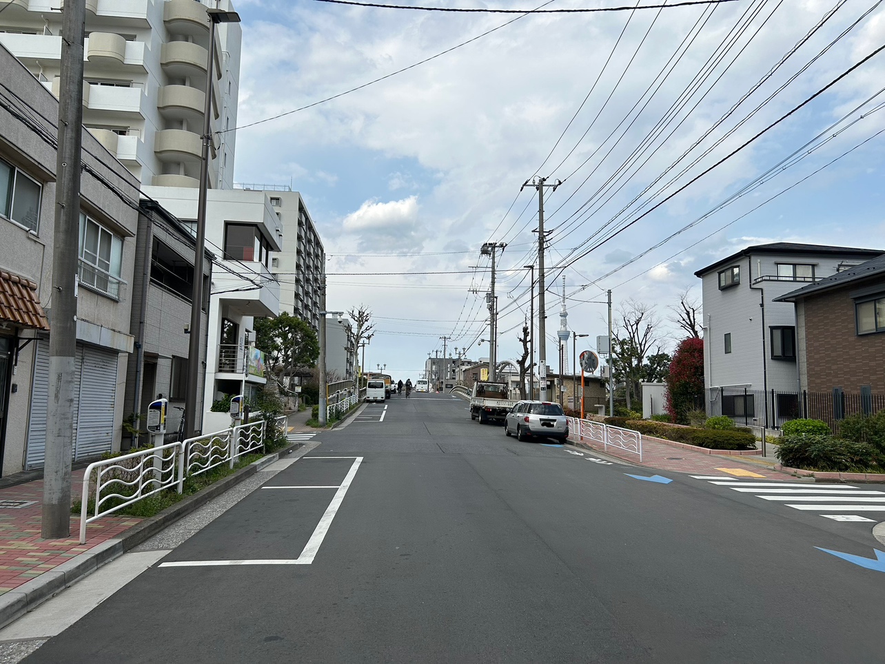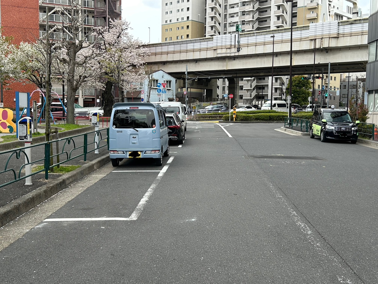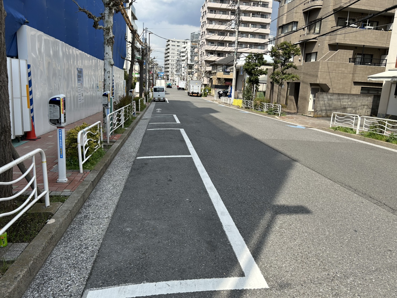 一方通行の東深川橋の南側にあるパーキングメーター。北の方角に歩けば小名木川があり、少しの時間気分転換に散歩するのに丁度よい。近くにはカフェも数店舗あるので、コーヒー片手に散歩するのもよいだろう。