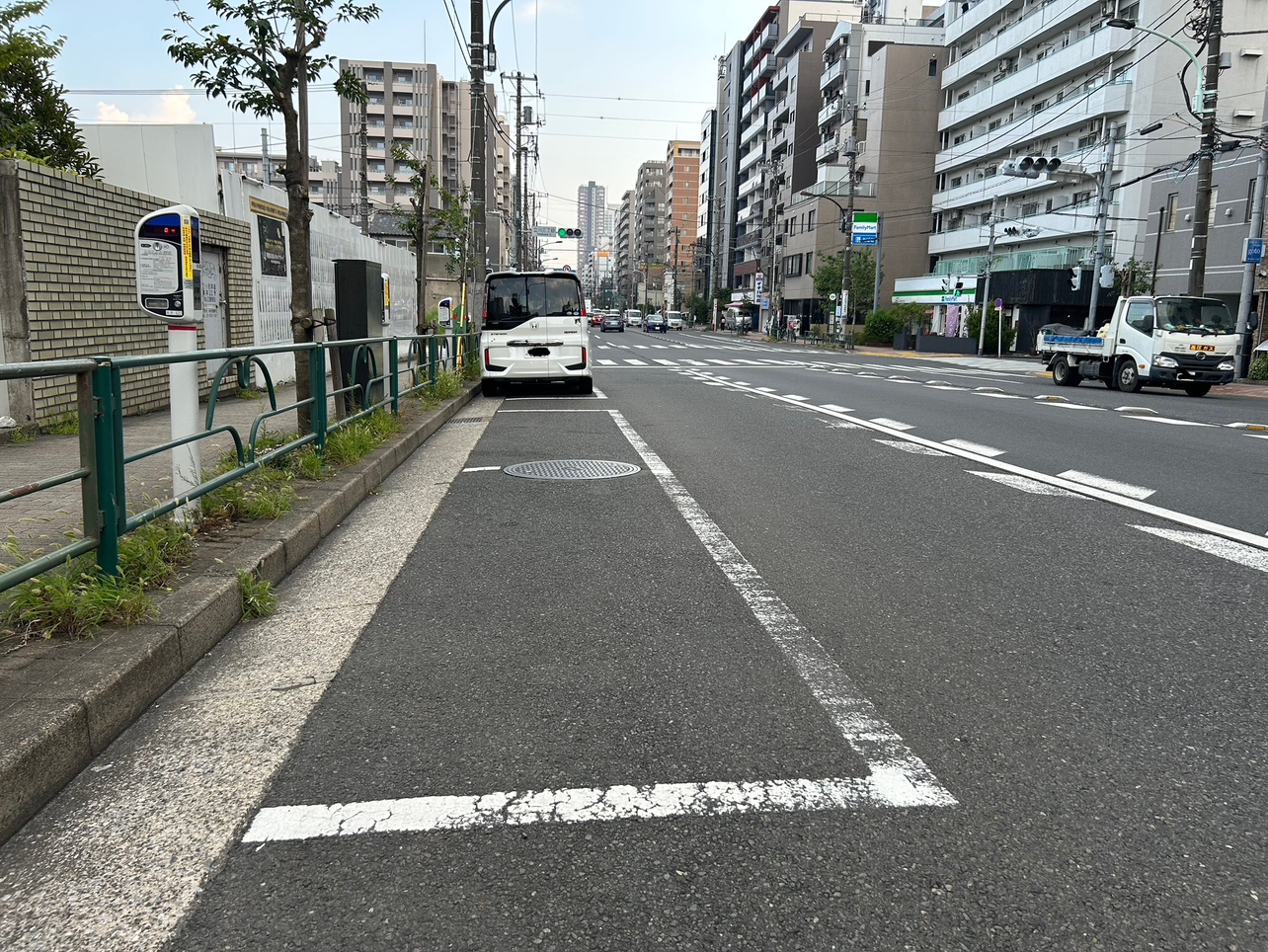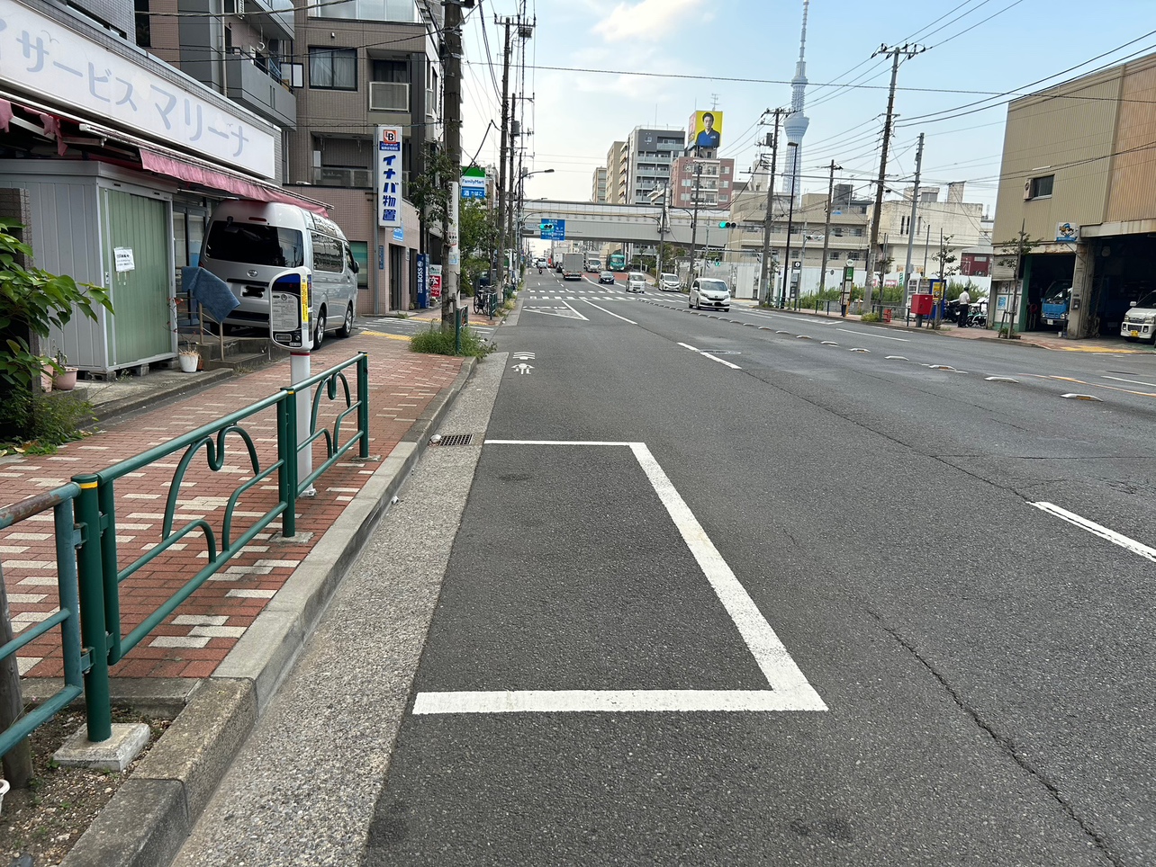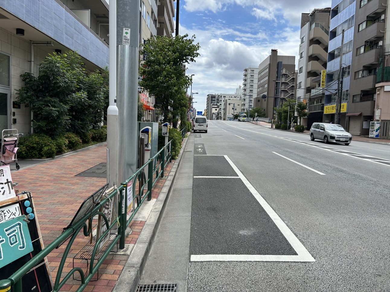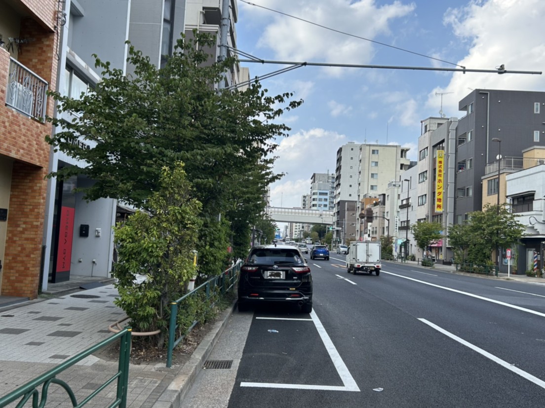 清澄通りの墨田区立川一丁目沿いにあるパーキングメーター。方角的には北から南の方向に走る道路沿いにあります。北側の千歳三丁目交差点と南側の森下駅交差点の間に1枠だけ白枠があります。1枠しかないので、停められなかった場合は反対車線沿いにあるパーキングメーターのご利用をお勧めします。